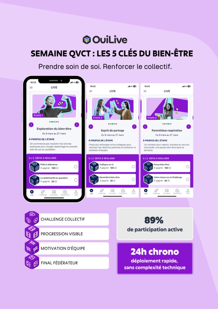Avec Les 5 clés du bien-être, la semaine QVCT devient une expérience collective qui aide les équipes à adopter de nouvelles habitudes bien-être. Quiz, sondages, défis photo ou vidéo et challenges physiques invitent les collaborateurs à passer de la sensibilisation à la pratique.